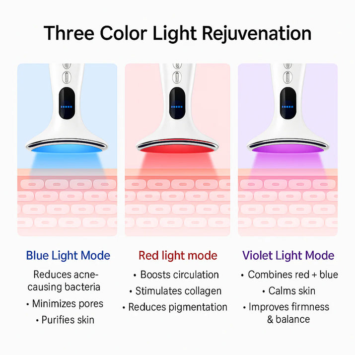 • Purple Light Therapy: Combines red + blue benefits, balancing skin tone while promoting repair and reducing signs of stress.
